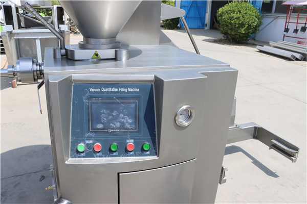 本机是由叶片泵充填、伺服电机驱动、人机界面、可编程控制器(PLC)控制的全自动真空定量灌装机,配装有自动扭结装置和200L提升机。既可以灌制肉糜肠、火腿肠、火腿等肠衣制品;又适用于天然肠衣、胶原蛋白肠衣、纤维肠衣等分份扭结。也可用于灌装各种瓶盒装产品.本机设有叶片自动补偿装置,分份定量精度可达±4克,传递物料轻柔,而且灌装速度、扭结速度、扭结圈数、每份的重量均可在触摸屏上设定。